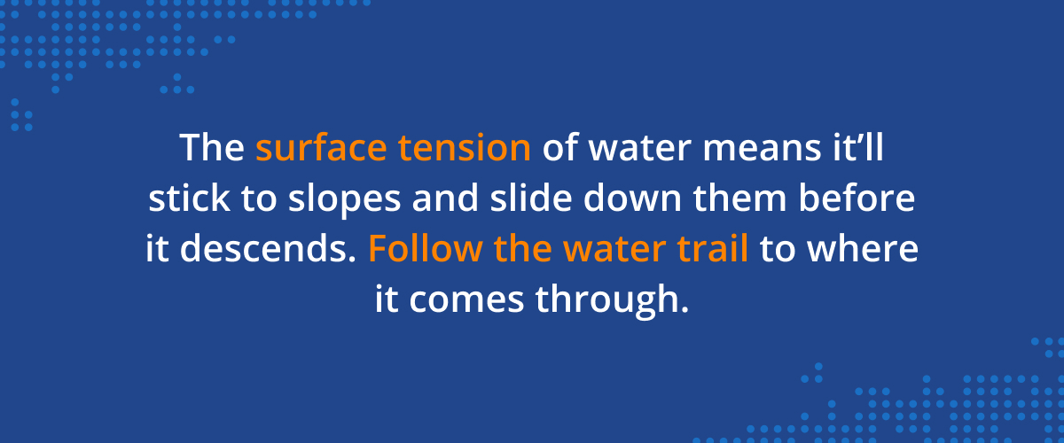 Most leaks don’t drip straight down from the entry point, but the surface tension of water means it’ll stick to slopes and slide down them before descending. Follow the water trail to where it comes through.